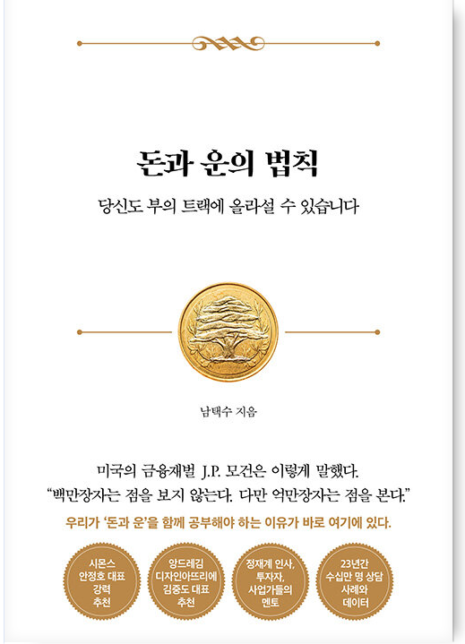오랜만에 재미있는 책을 읽고 리뷰를 써 봅니다. 바로 남택수 작가님의 첫 번째 책인 "돈과 운의 법칙"입니다. 책 제목에서 유추할 수 있듯 돈과 운의 관한 이야기이며 돈을 잘 벌려면 운도 따라야 하는 법칙에 대해 자세하게 알 수 있는 책입니다. 부동산이나 돈, 운에 관해 관심이 많은 분이라면 좀 더 재미있게 볼 수 있을 책입니다. 저자는 운이 흐름이 있고 흐름을 잘 타기 위해서는 배움을 게을리하지 말고 노력하고 공부하여 여러 경험을 통해 항상 준비되어 있는 삶의 태도와 마음가짐을 가지라고 말합니다. 그렇게 했을 때 운의 흐름을 탈 기회가 많아진다고 합니다.  저자는 "인생에 기회는 3번 있다"라는 말은 틀렸고 "기회는 훨씬 많고 그러니 좌절이나 포기할 필요 없이 앞으로 있을 기회에 집중하고 잡을 수 있도록 준비해야 한다"라고 강조합니다. 책 내용은 돈과 운의 개념에 대해 말해주고 돈의 흐름에 올라탈 수 있는 방법, 잘못된 흐름을 바꿀 수 있는 방법, 그리고 마지막은 Q&A로 구성되어 있습니다. 누구에게나 좋은 운의 구간은 오기 때문에 그때 최대한의 운을 발휘하는 방법에 대해 안내해 주며 운이 안 좋은 사람보다는 좋은 운을 만났을 때에도 자신의 가능성을 믿지 않고 그 운을 제대로 쓰지 못하는 사람들을 위해 조언해 줍니다. 모두에게 오는 운이 좋은 구간에 자신의 인생을 레벨업 할 수 있어야 한다고 강조합니다. "돈과 운의 법칙"은 돈과 운이 맞물려 돌아가는 원리와 실행해야 될 법칙 28가지를 다양한 사례를 풀면서 만든 책입니다. 운의 흐름을 가볍게 여기지 말고 더욱 강하게 만들게 해 주는 컨설팅 내용입니다. 좌절하거나 포기 단계라면 자신감을 되찾게 해 주고 과거를 돌아보고 반성하며 미래를 다시 개척해 나갈 수 있도록 용기를 주는 책입니다. 저자는 시간이 운의 법칙에서도 중요한 의미가 있다고 말합니다. 자기 인생에서 중요한 일이라면 그 일을 최소 5년은 지속해서 해야 되고 그 정도 시간을 쏟아야 자기 성장에 밑거름이 되는 여러 가지 상황들을 겪으면서 비로소 나의 대해 제대로 알고 앞으로 정진할 수 있다고 말합니다. 어렵지 않은 내용이라 지루하지 않게 읽을 수 있는 책이고 그래서 더 여러 가지 내용이나 문구가 기억에 남습니다. 감의 운의 한계를 스스로 정하지 말고 나아가시기 바랍니다. 그 크기는 누구도 모르기 때문입니다. 사람 만나서 깨지는 것을 두려워하지 말고 세상이 기회를 제공하면 무조건 낚아채서 사람들과 엮어 다양한 경험을 하는 것이 업계에서 빠른 속도로 성장하는 첫 번째 비법입니다. 부의 트랙을 갈아타서 월급쟁이에서 사업가로, 사업가에서 자본가로 거듭나시기 바랍니다. 자신의 부의 크기를 한계 짓지 말고 나아가시기 바랍니다. 알 수도 있는 내용이면서 자각하지 못하고 있던 내용도 있는 책입니다. 가볍게 읽으면서 나중에도 또 읽고 싶어지는 책입니다. 자신의 성장과 부에 관심이 있는 사람이라면 이 책을 읽고 실제로 반성하며 적용한다면 좋습니다. 자신감이 없고 용기가 없어서 실행을 못하고 있는 사람이라면, 이 책을 일곡 무조건 실행했으면 좋겠습니다. 그냥 책만 읽고 실행하지 않는 다면 부자가 될 수 있는 기회를, 운의 흐름을 놓쳐 버릴 수도 있기 때문입니다. 부와 인생을 성장시키는 계기가 되는 책입니다. 돈도 좋아하고 운도 좋아하는 분들은 특히나 읽어보면 아주 재미있게 읽을 수 있는 책이니 적극적으로 권장드립니다.